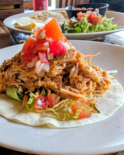 手前が私のタコス。奥のがリリの、なんかタコス生地のあいだにチーズがはさんであるやつ。見た目では私のがボリューミーに見えるけど、リリのが何倍かの量がありボリューミー。