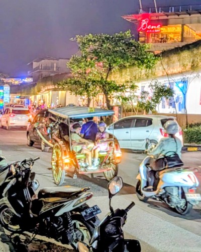 ビーチからビーチ沿いの道路にあがると、ものすごい数のバイクや観光客用の馬車(ドッカル)。レストランなど飲食店の大音響、ものすごい数の人。欧米の人や、中国の旧正月のためおそらく中国人らしき方々……日本人はあまり見かけない。路上の客引きの人たちからも「チャイニーズ?」と声をかけられた。