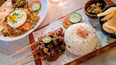 手前がサテというインドネシアの焼き鳥。ピーナッツソースが美味しいんですよね。うんうん、この味、この味、なつかしい。そしてまるいお皿が海鮮ナシゴレン。インドネシアのチャーハン。これも美味しかった。