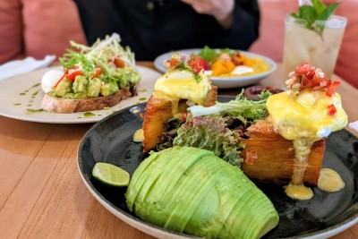 私は隣のテーブルの人が食べていたおいしそうなのを頼んだ。フッドベネディクト。ベネディクトって普通はパンでできているけど、これはジャガイモ。薄くスライスしたのがクレープみたいに重ねてあるの、見えますか? それがカリッと……揚げてあるのかな、たぶん。これにアイスコーヒー。