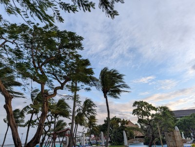 プールの「あっちのはじっこ」の向こうの、海沿い近く。ヤシの木がゆらゆら。風に揺れてる。その向こうの遊歩道では、走る人がチラホラ。こんな早朝にもう走るのね。