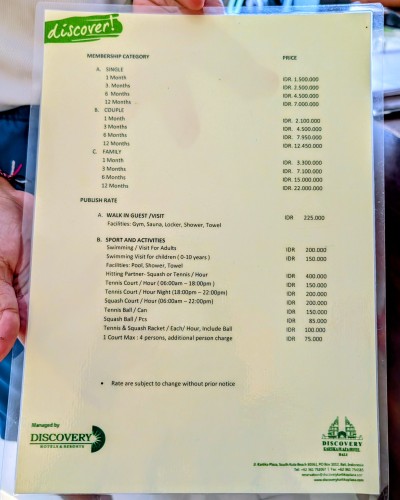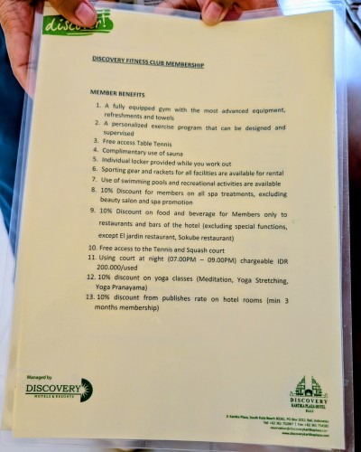 見学はすぐに終わり、今度は、どうすれば会員になれるか、料金体系を尋ねた。私は日本人で、バリ島には観光で来ていること、夏にも観光でくるのだけど、そのときにカルティカプラザホテルには宿泊しないけど会員になることはできるのかと質問をした。すると、またプールスタッフさんがスパスタッフさんに質問してくれて、答えがきた。