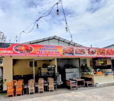 みなさんとおなじ豚肉系のワンプレート25000ルピア。私たちはふたりで一皿。これに飲み物をそれぞれつけてぜんぶで65000ルピア。地元食堂はこのくらいの価格で安くていいわ~。