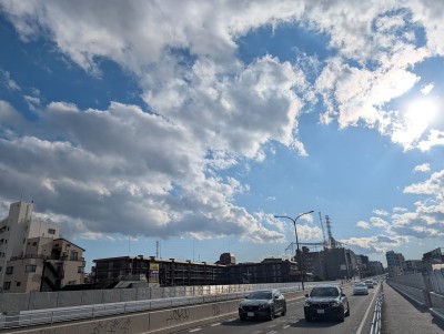 空の雲がなんとなくお正月っぽい。ずっと坂道。この坂道を電動自転車で行くのが好き。晴れていてよかった。