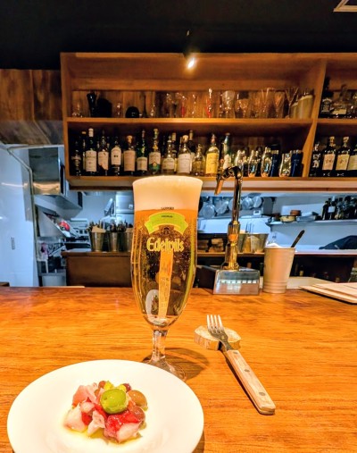 エーデルピルス880円。チャージ330円でお通しはタコとオリーブのマリネ。美味し~。