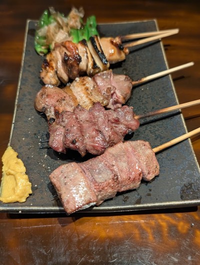 そしてお店の名物……なのかな?「やきとん」盛り合わせ。だったか……とんじゃないのもはいっていたか……(笑)や、バラでオーダーした気もする(笑)